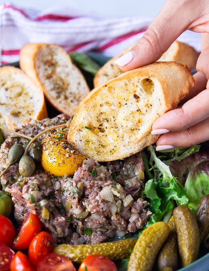 - Egg Y0lk. This one goes on high of the completed tartare quite than within the combine. Nonetheless, you’ll want to interrupt it up as you scoop a few of the steak tartare for a luscious creamy style and texture!