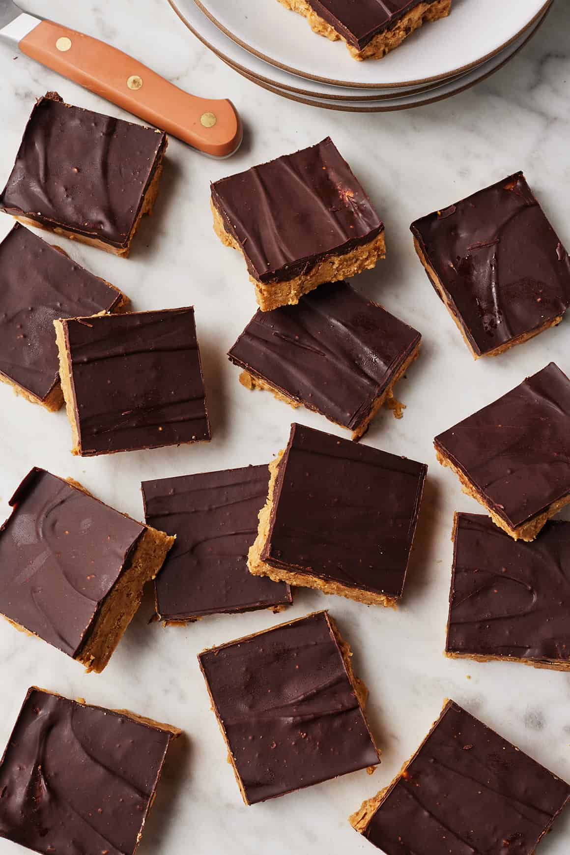 - Don’t skimp on the chilling time. The chocolate will arrange after only a few hours, however the peanut butter layer wants 8 hours or extra to turn into fully agency. Trying on the chocolate layer, it may be tempting to slice the bars sooner. Whereas they’ll nonetheless style nice, they’ve the perfect, most cohesive texture after a full in a single day chill.